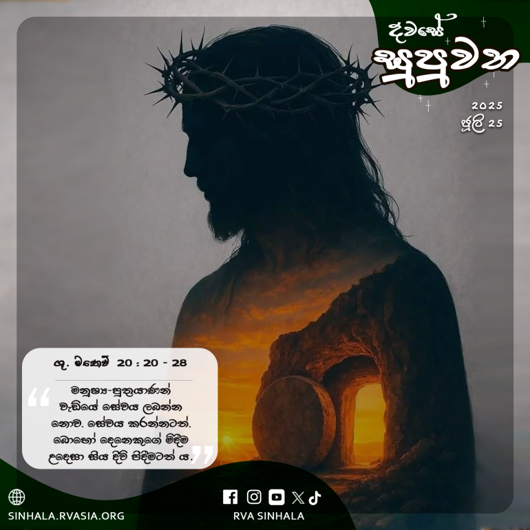 25 එහෙත්, ජේසුස් වහන්සේ ඔවුන් තමන් වෙත කැඳවා මෙසේ වදාළ සේක: ”විජාතීන්ගේ ආණ්ඩුකාරයින් ඔවුන් කෙරේ ආධිපත්යය පවත්වන බවත්, ඔවුන්ගේ ප්රධානීන් ඔවුන් කෙරේ බලය පවත්වන බවත් ඔබ දන්නහු ය. 26 එහෙත්, ඔබ අතර එසේ නොවිය යුතු යි. ඔබ අතර යමෙක් නායකයා වන්න කැමැත්තේ නම්, ඔහු ඔබේ සේවකයා වන්නේ ය. 27 ඔබ අතර යමෙක් ප්රධානියා වන්න කැමැත්තේ නම්, ඔහු ඔබේ දාසයා වන්නේ ය. 28 මනුෂ්ය-පුත්රයාණන් වැඩියේ සේවය ලබන්න නොව, සේවය කරන්නටත්, බොහෝ දෙනෙකුගේ මිදීම උදෙසා සිය දිවි පිදීමටත් ය.”