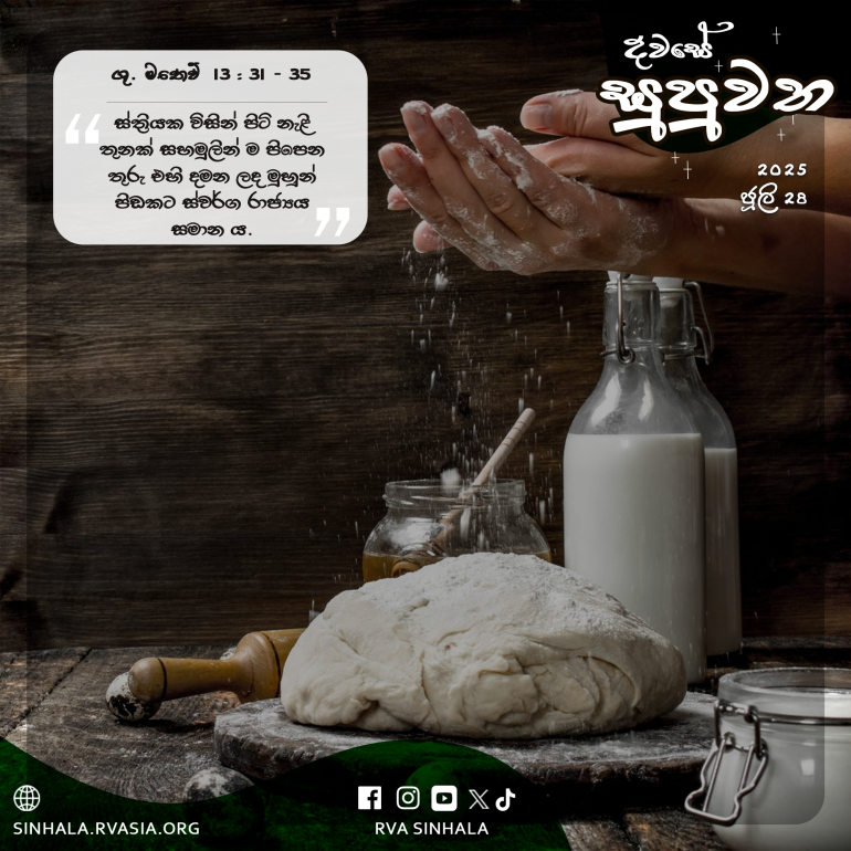 33 උන් වහන්සේ තවත් උපමාවක් වදාරමින්, ”ස්ත්රියක විසින් පිටි නැළි තුනක් සහමුලින් ම පිපෙන තුරු එහි දමන ලද මුහුන් පිඩකට ස්වර්ග රාජ්යය සමාන ය”යි කී සේක.