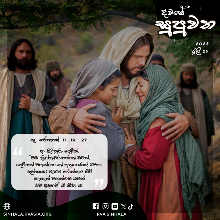 25 ජේසුස් වහන්සේ කතා කරමින්, පුනරුජ්ජීවනය ද, ජීවනය ද මම වෙමි; මා අදහාගන්නා මැරුණත් ජීවත් වන්නේ ය; 26 ජීවත් ව සිටින, මා අදහාගන්න කිසිවෙක් කිසි කලෙක නො මැරෙන්නේ ය. ඔබ මෙය අදහන්නෙහි දැ”යි ඇසූ සේක.