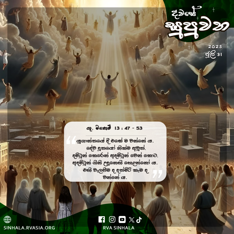 47 ”ස්වර්ග රාජ්යය වනාහි, මුහුදේ හෙළන ලද, සියලු වර්ගවල මසුන් හසු කරගත් දැලකට සමාන ය. 48 ඒ දැල පිරුණු කල, ධීවරයෝ එය වෙරළට ඇද, හිඳගෙන, හොඳ මසුන් භාජනවලට එකතු කොට නරක මසුන් ඉවත දැමූ හ. 49 යුගාන්තයේ දී එසේ ම වන්නේ ය. දේව දූතයෝ නික්ම අවුත්, දමිටුන් කෙරෙන් අදමිටුන් වෙන් කොට, 50 අදමිටුන් ගිනි උදුනෙහි හෙළන්නෝ ය. එහි වැලපීම ද දත්මිටි කෑම ද වන්නේ ය.