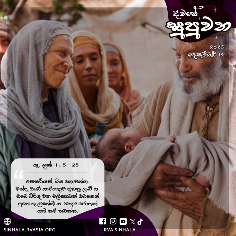 5 ජුදාහි රජ වූ හෙරොද්ගේ කාලයෙහි අබියාගේ පේරුවට අයත් සෙකරියස් නම් එක් පූජක නමක් විය. ඔහුට ආරොන්ගේ පෙළපතෙන් බිරිඳක් වූවා ය. ඇගේ නම එලිසබෙත් ය. 6 මේ යුවල සමිඳාණන් වහන්සේගේ සියලු ආඥා හා නියෝග නිවැරදි ව පිළිපදිමින් දෙවියන් වහන්සේ අබිමුවෙහි දැහැමින් විසූ හ. 7 එලිසබෙත් වඳ ව සිටි බැවින් ඔවුන්ට දරුසම්පතක් නො වී ය. ඇරත් ඒ දෙපොළ වයස් ගත ව සිටියහ.