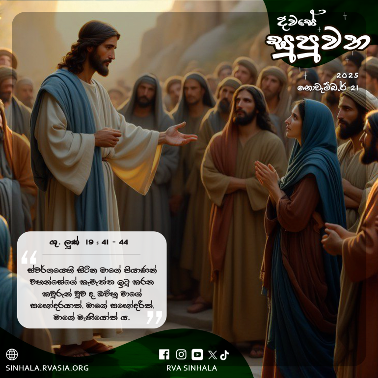 46 උන් වහන්සේ සමූහයාට කතා කරමින් සිටිය දී ම උන් වහන්සේගේ මෑණියෝ ද සහෝදරයෝ ද උන් වහන්සේ හා සමඟ කතා කරන්න ප්රස්තාවක් සොයමින් පිටත සිටියහ. 47 එවිට එක් කෙනෙක් උන් වහන්සේට කතා කොට, ”බලන්න, ඔබේ මෑණියෝ ද සහෝදරයෝ ද ඔබ සමඟ කතා කරන්න ප්රස්තාවක් සොයමින් පිටත සිටිති”යි කී ය. 48 එහෙත්, උන් වහන්සේ එසේ කී අයට උත්තර දෙමින්, ”මාගේ මෑණියෝ කවුරු ද? මාගේ සහෝදරයෝ කවුරු ද?” කියා 49 සිය ශ්රාවකයන් දෙසට අත දිගු කොට, ”මෙන්න, මාගේ මෑණියෝ සහ සහෝදරයෝ! 50 ස්වර්ගයෙහි සිටින මාගේ පියාණන් වහන්සේගේ කැමැත්ත ඉටු කරන කවුරුන් වුව ද, ඔව්හු මාගේ සහෝදරයාත්, මාගේ සහෝදරීත්, මාගේ මෑණියෝත් ය”යි වදාළ සේක.