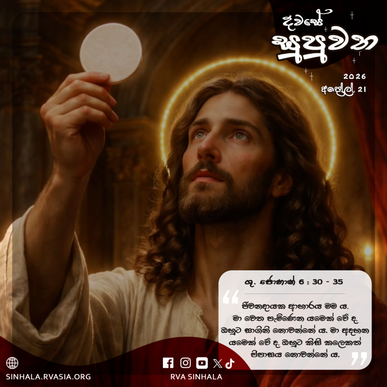 35 ජේසුස් වහන්සේ කතා කොට, ”ජීවනදායක ආහාරය මම ය, මා වෙත පැමිණෙන යමෙක් වේ ද, ඔහුට සාගිනි නොවන්නේ ය. මා අදහන යමෙක් වේ ද, ඔහුට කිසි කලෙකත් පිපාසය නොවන්නේ ය.