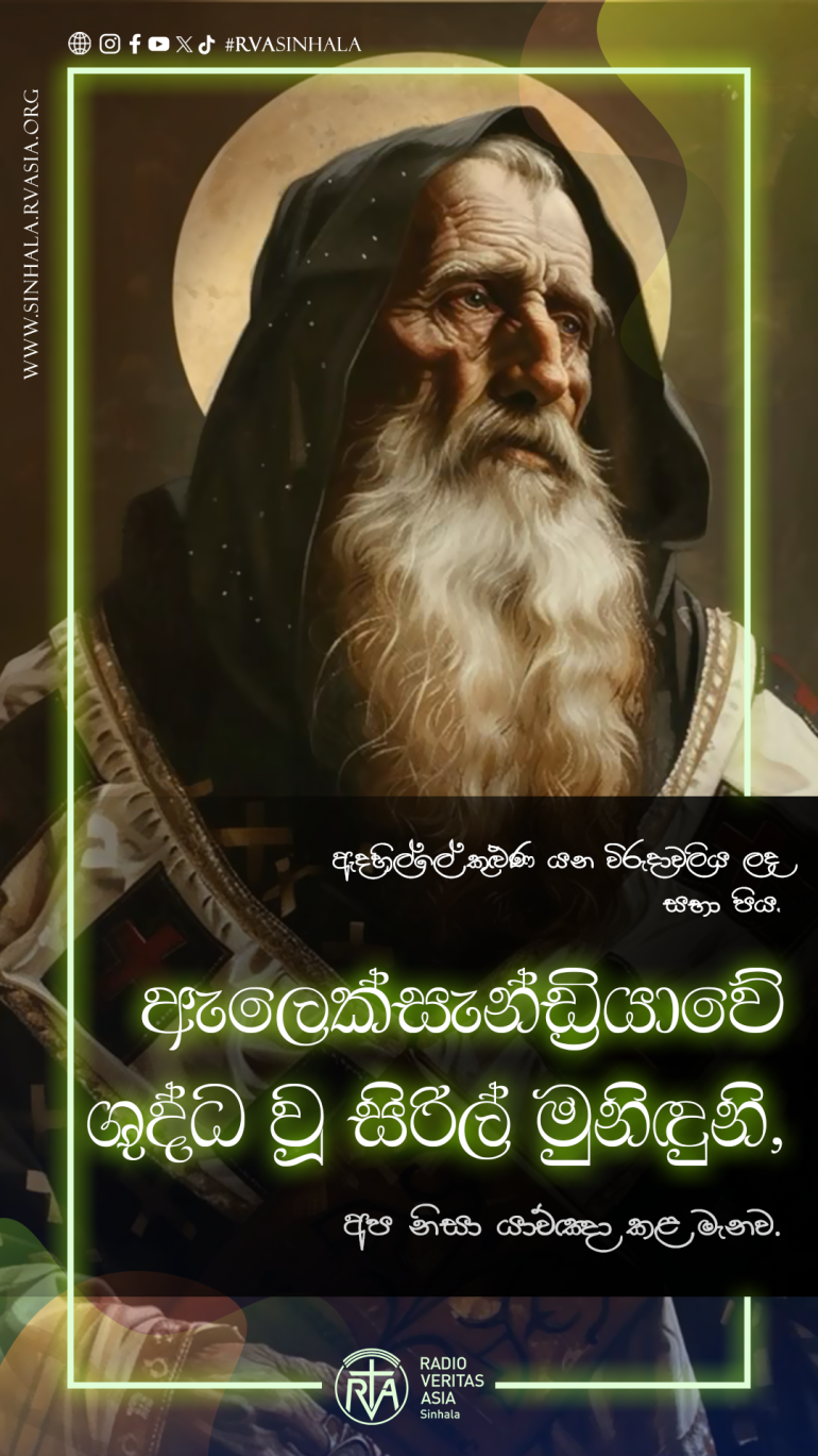 අද දින සුදුවර චරිතයෙන් ජුනි 27 වන දිනට මංගල්යය යෙදෙන ඇලෙක්සැන්ඩ්රියාවේ ශුද්ධ වූ සිරිල් මුනිඳුන් ගැන කතා කරමු.
